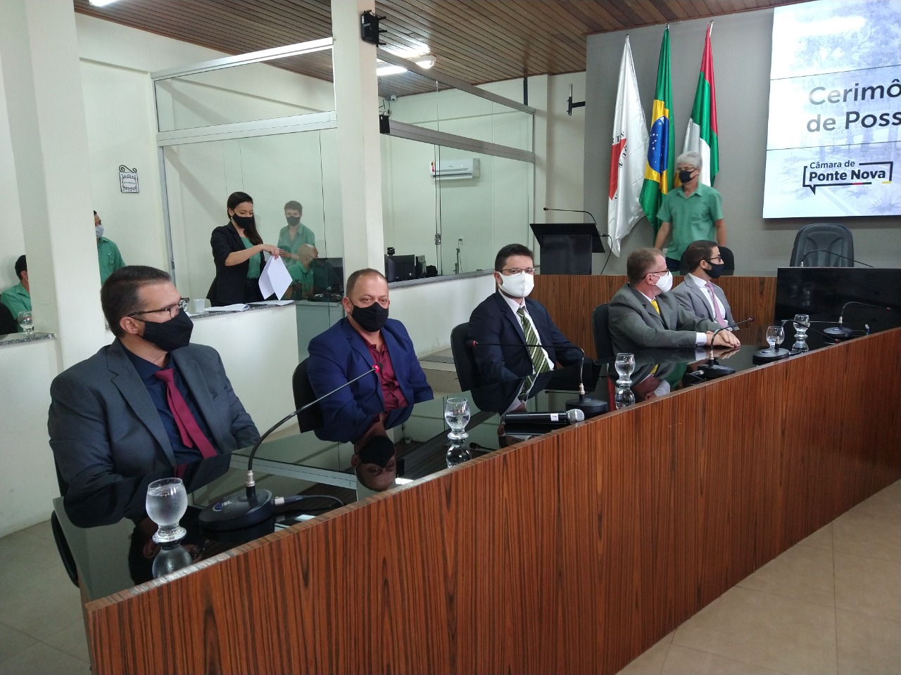 Na cerimônia de posse, comandada pelo assessor de comunicação da Câmara Municipal de Ponte Nova, Ronaldo Fernandes, doze dos treze vereadores eleitos fizeram o juramento ritualístico para o cargo e assinaram o termo de posse como manda o protocolo.
