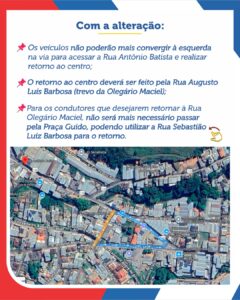 Os condutores que desejarem retornar à Rua Olegário Maciel poderão fazê-lo pela Rua Sebastião Luiz Barbosa, sem necessidade de passar pela Praça Guido.