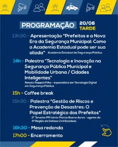 20 de agosto: voltado a gestores, autoridades e lideranças, com palestras sobre governança colaborativa, captação de recursos, cidades inteligentes e gestão de riscos.